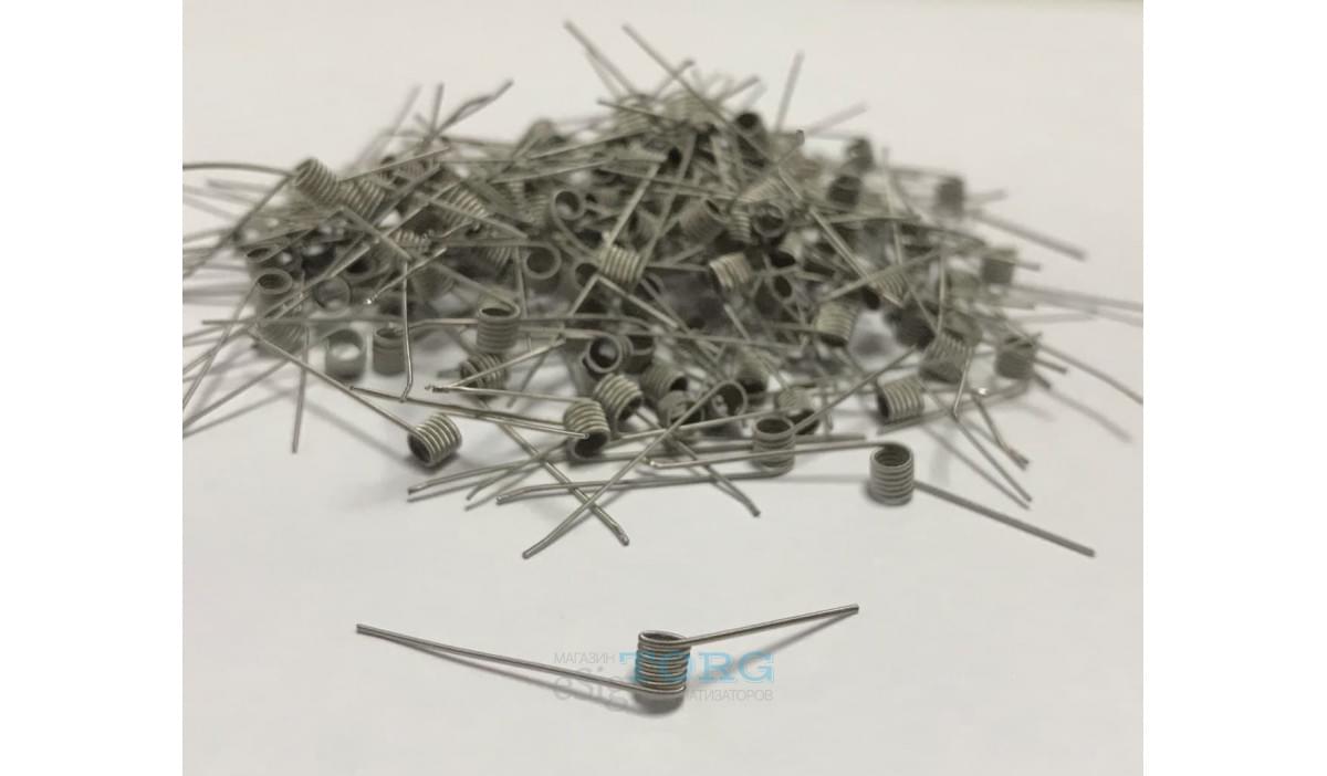 Намотка, состоящая из 2-х жил, обвитых тонким нихромом. Благодаря нихрому спираль быстрее разогревается, а также остывает. Две центральные жилы -0,2 нихром Обмотка - 0,1 нихром Диаметр витка - 2,5 мм Кол-во витков - 5, но длинные ножки позволяют добавить пару витков, при необходимости. Спирали изготовлены из высококачественной проволоки и проходят ультразвуковую очистку на профессиональном оборудовании с использованием специальных моющих средств. Благодаря этому спирали живут дольше и обеспечивают лучший вкус. Сопротивление: 1 спираль: 0.88-0.92 ом 2 спирали: 0.44-0.46 ом